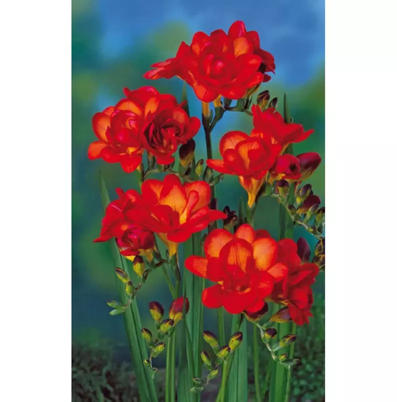 Фрезия махровая Red 10шт - красивоцветущее клубнелуковичное растение, превосходные одиночно посаженные цветы фрезии окрашены в ярко-красный оттенок с вкраплением нежно-белого у основания лепестков, диаметр цветочков до 6 см. Время цветения приходится на апрель-сентябрь ( зависит от времени высадки), аромат насыщенный, напоминает запах ландыша. Листья линейные, узкие, зеленые, цветонос крепкий, высотою 20-35 см.